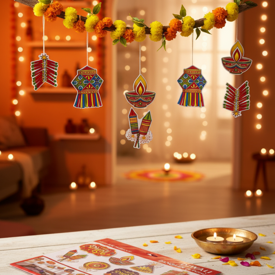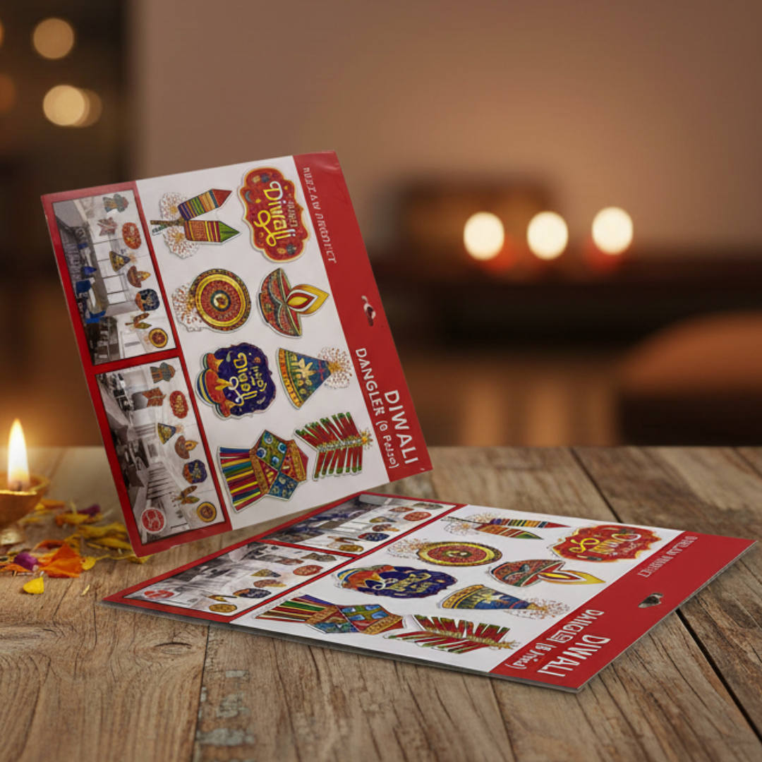 Brighten your festive decor with our vibrant Diwali Danglers (8 Pieces)! This delightful set features traditional motifs like diyas, firecrackers, and "Happy Diwali" wishes, perfect for adding a touch of joy and color to any space. Easy to hang, these festive decorations are ideal for homes, offices, or events, creating a warm and inviting atmosphere for your Diwali celebrations.